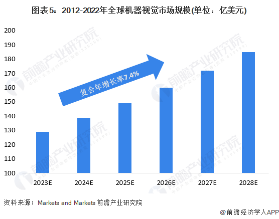 現(xiàn)代工業(yè)自動(dòng)化技術(shù)日趨成熟,越來越多的制造企業(yè)考慮如何采用機(jī)器視覺來幫助生產(chǎn)線實(shí)現(xiàn)檢查、測(cè)量和自動(dòng)識(shí)別等功能,以提高效率并降低成本,從而實(shí)現(xiàn)生產(chǎn)效益最大化。機(jī)器視覺作為新興技術(shù)被寄予厚望,被認(rèn)為是自動(dòng)化行業(yè)一個(gè)具備光明前景的細(xì)分市場(chǎng)。據(jù)Markets and Markets預(yù)測(cè),全球機(jī)器視覺市場(chǎng)2022-2027年預(yù)測(cè)期內(nèi)的復(fù)合年增長(zhǎng)率為7.4%,至2027年,全球機(jī)器視覺市場(chǎng)規(guī)模將達(dá)到172億美元。前瞻基于全球機(jī)器視覺市場(chǎng)規(guī)模數(shù)據(jù)預(yù)測(cè),2028年全球機(jī)器視覺市場(chǎng)規(guī)模將達(dá)到185億美元。