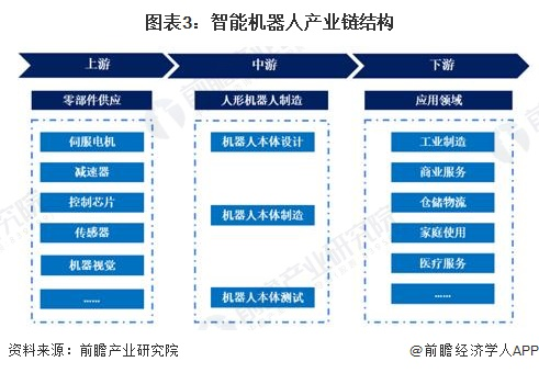智能機(jī)器人產(chǎn)業(yè)鏈可以分為上中下游三個(gè)層次。上游主要是伺服電機(jī)、減速器、傳感器、專用芯片等核心零部件;中游是以人形機(jī)器人為主的智能機(jī)器人本體制造,包括設(shè)計(jì)、制造、測試三大環(huán)節(jié)。下游為人形機(jī)器人應(yīng)用領(lǐng)域,包括工業(yè)制造、倉儲(chǔ)物流、醫(yī)療服務(wù)、商業(yè)服務(wù)、家庭使用等。